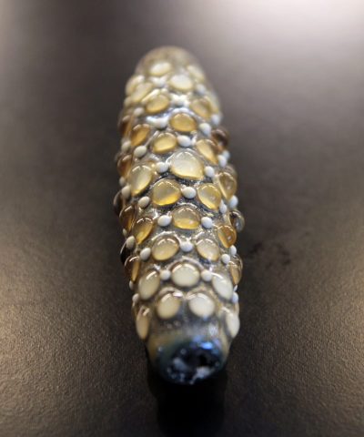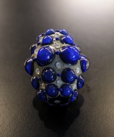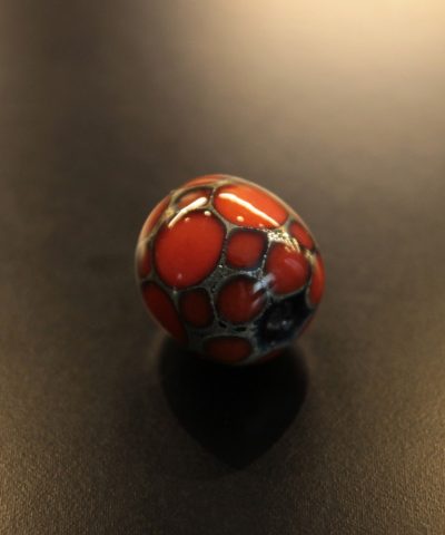 Handcrafted glass bead of great elegance, created using the lampworking technique. It is a round bead with a black base adorned with corallite dots and olive green decorations.