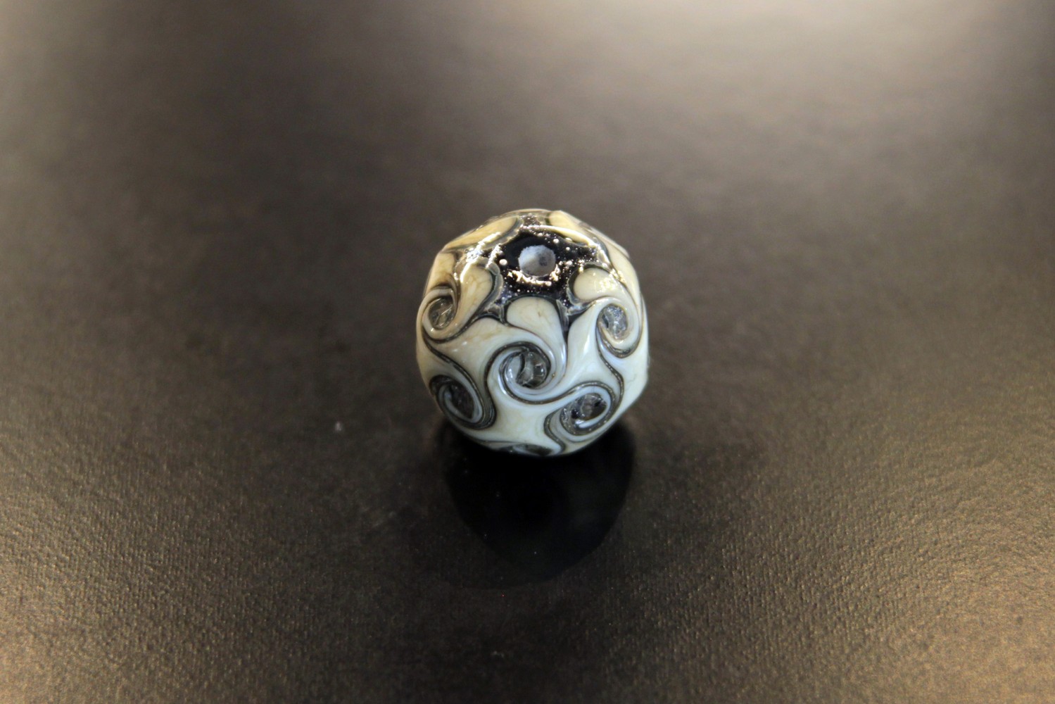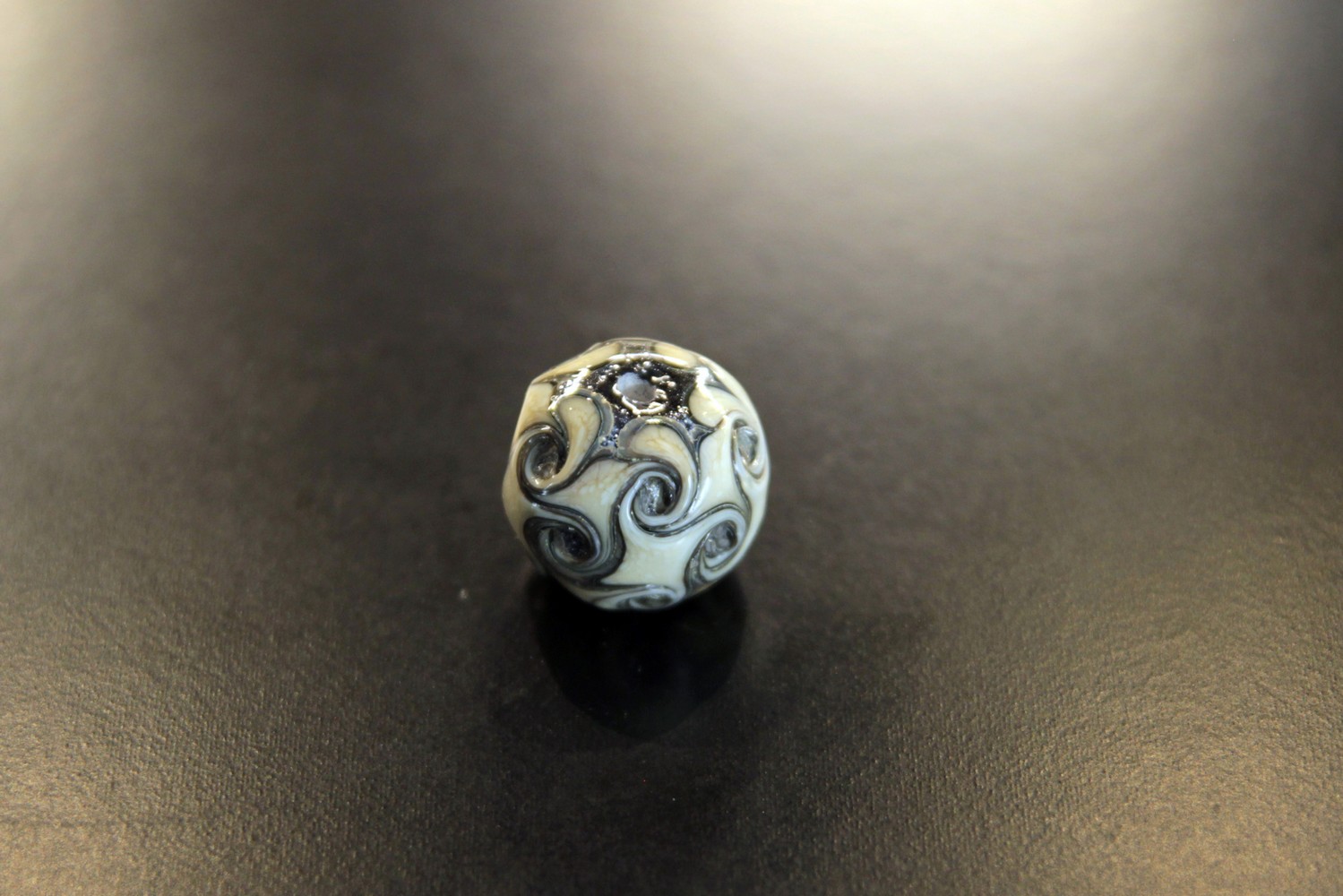 Ivory glass bead with twisted dots, with a metallic base made from a burnt silver leaf. The bead is elegant and sophisticated, with a unique design that catches the eye and adds a touch of class to any creation. The combination of ivory glass and burnt silver base creates an interesting contrast and adds a touch of refinement to any jewelry or accessory.