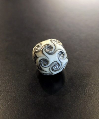 Glass bead with metallic effect base created by burning a silver leaf. The surface is dotted with small green, light turquoise, ivory, and blue dots, adding a touch of color and brightness to the bead. The overall effect is elegant and sophisticated, ideal for creating high-quality jewelry with a great visual impact.