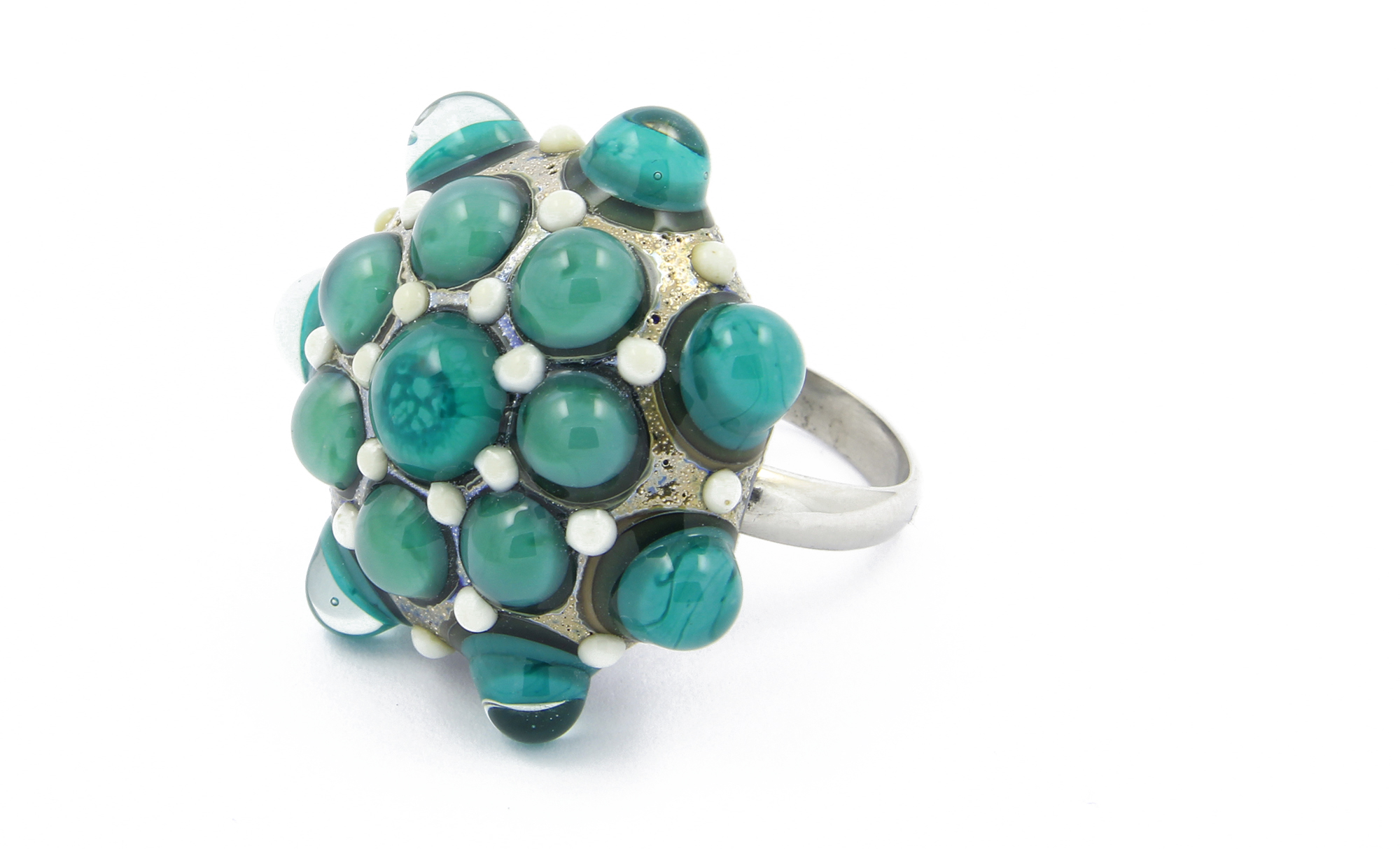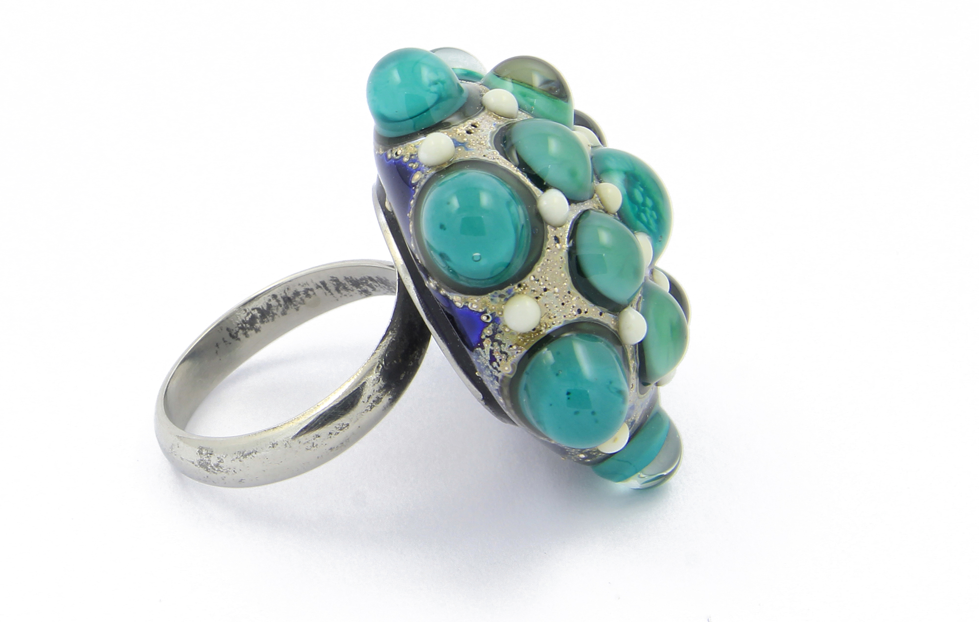 Glass ring made using the lampwork technique, featuring raised dots in sea green that create an elegant and dynamic effect. The metal part of the ring is handcrafted in steel, with a refined finish that enhances the beauty of the glass, creating a perfect balance between modernity and craftsmanship.