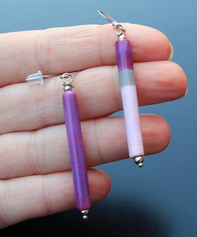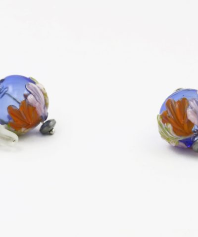 Le perle soffiate di questi orecchini sono create con la tecnica della soffiatura a lume che riproduce, in piccolo, la tecnica del soffiato in fornace. Del vetro fuso è messo sulla punta di un tubo in acciaio, la canna da soffio, e soffiato fino a creare una bolla d’aria al suo interno. Dopo che la prima bolla si è creata si continua con movimenti precisi e altri soffi fino a raggiungere la dimensione e la forma desiderata.
