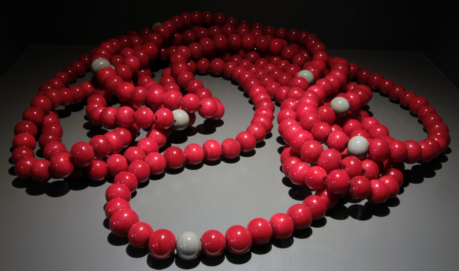 Collana in vetro rossa e grigia, unico filo della lunghezza di circa 3,50 metri