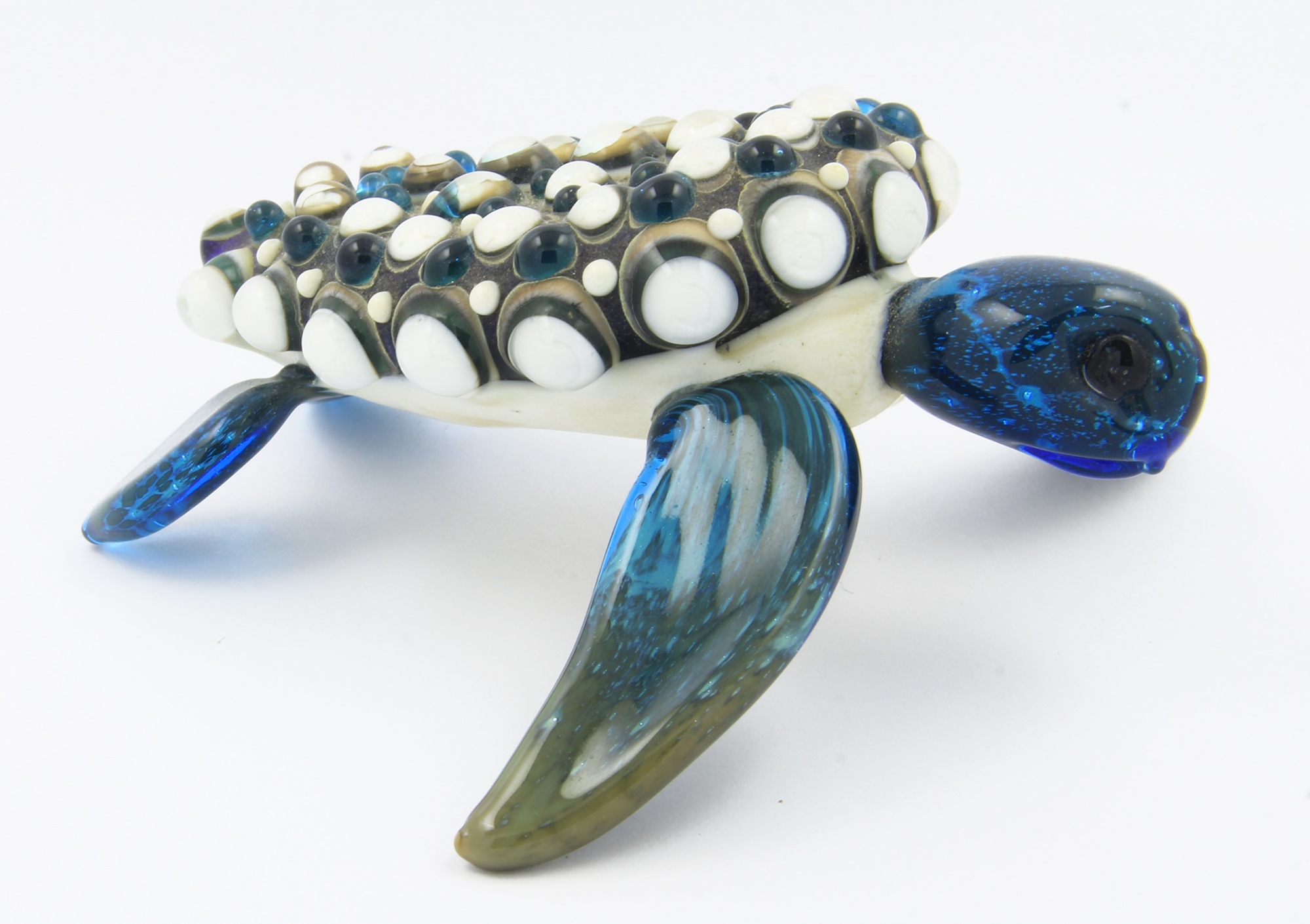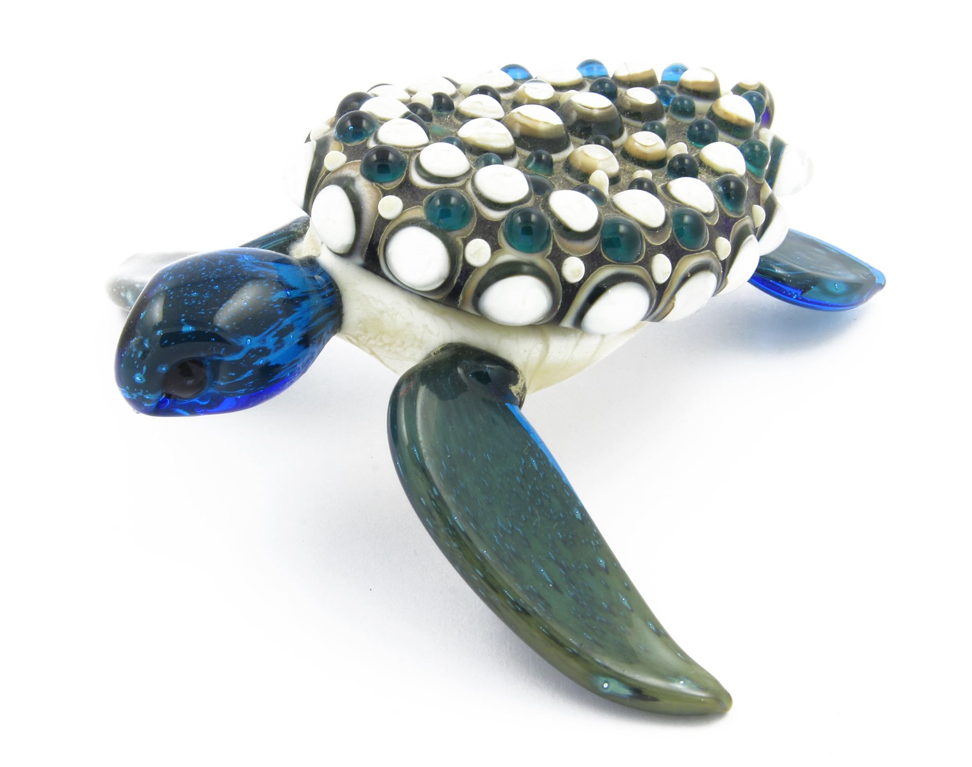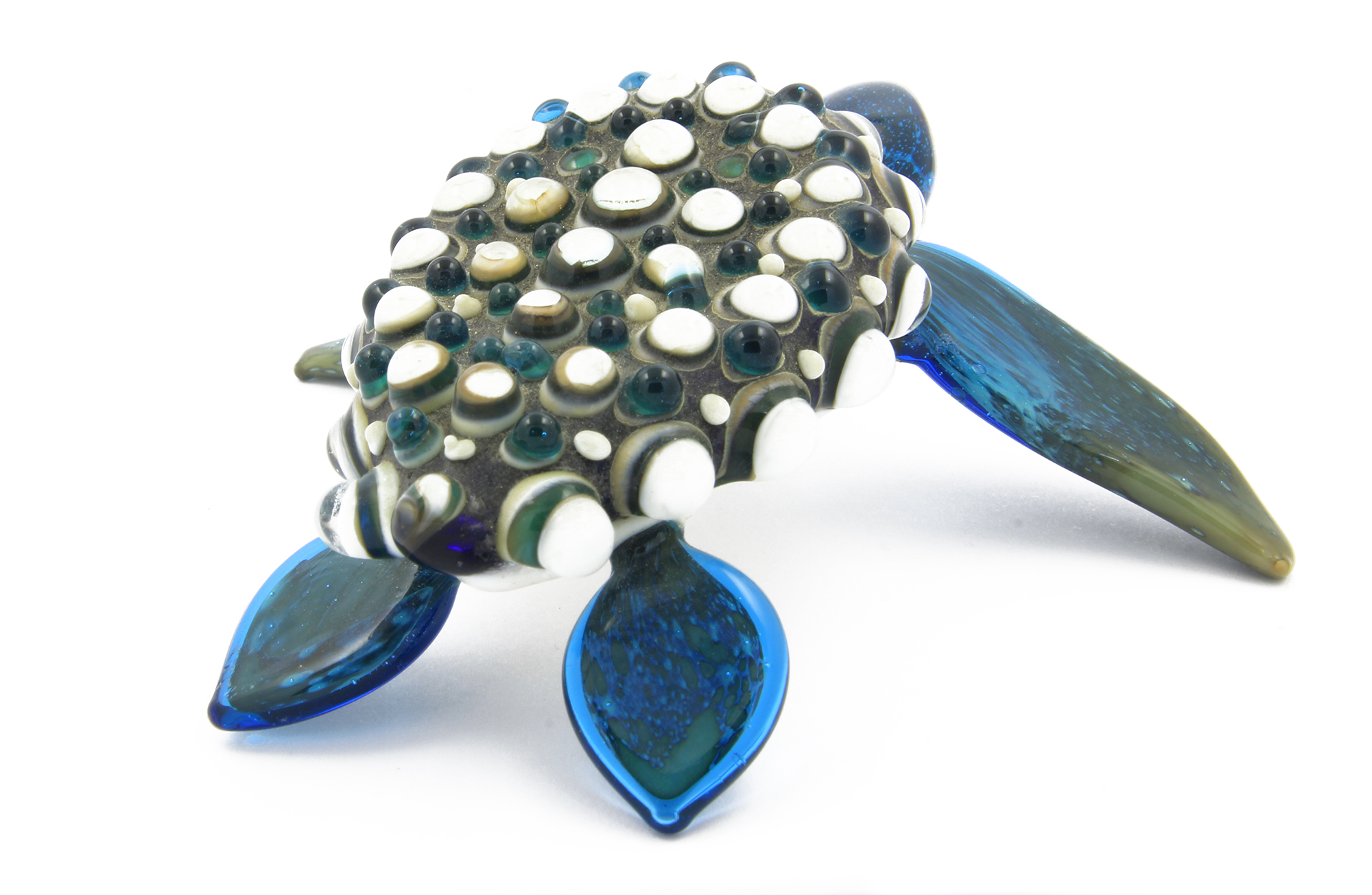 Tartaruga realizzata in vetro, con il carapace decorato come una mia perla fenice con l uso della foglia d’ argento fusa alla base della decorazione.